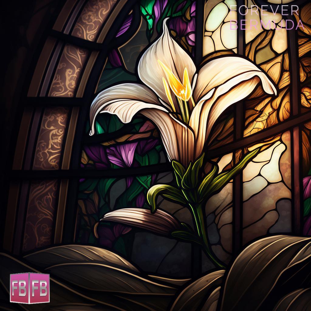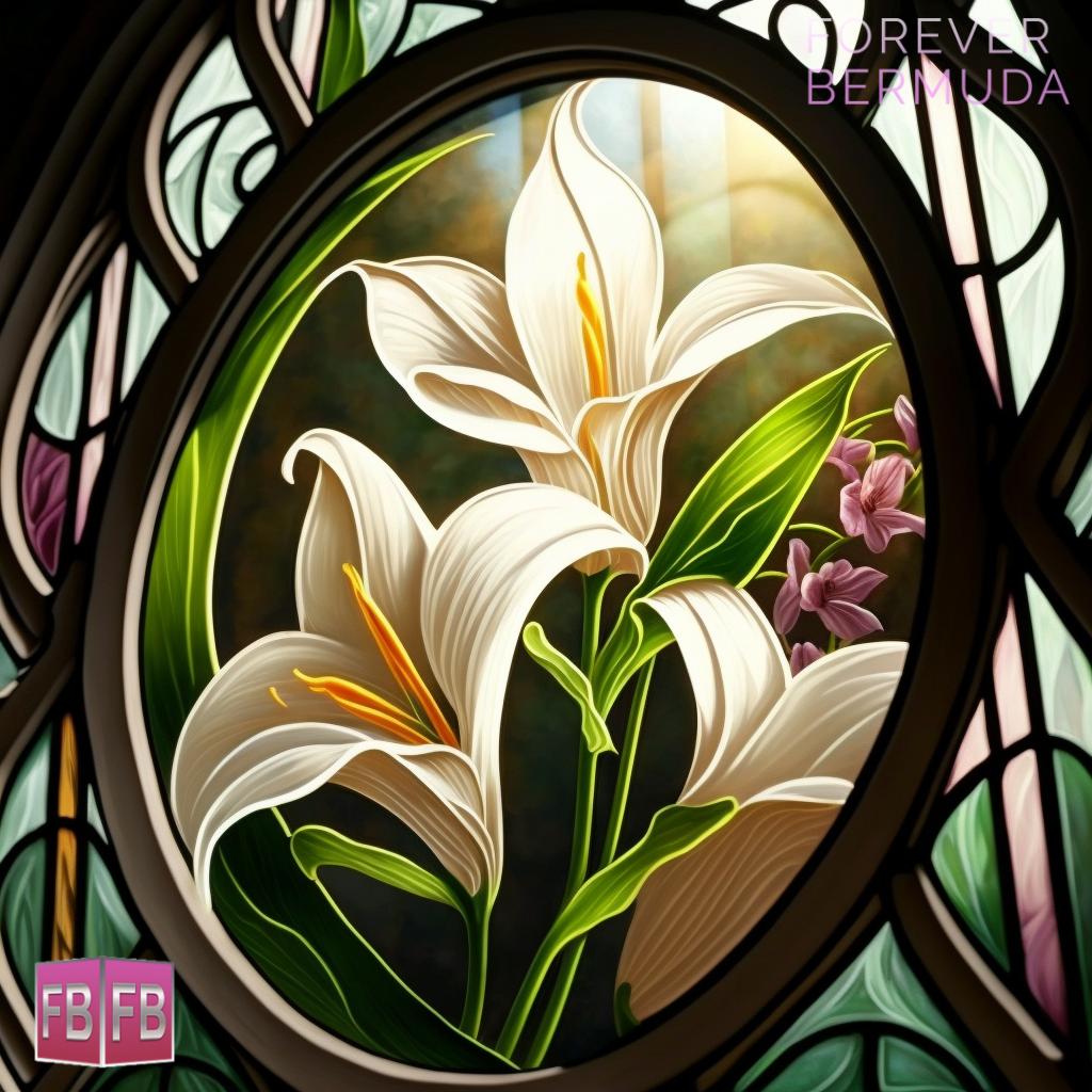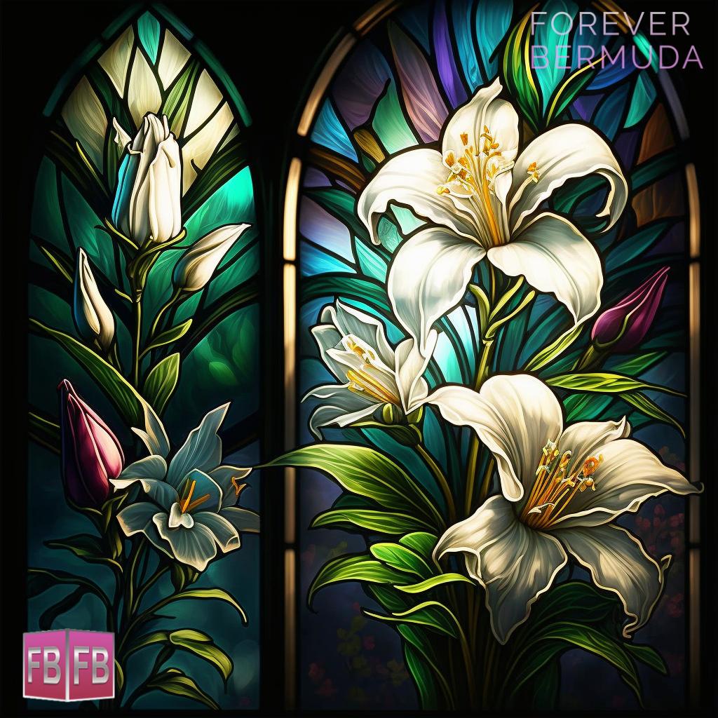 This week’s virtual art photo gallery from Forever Bermuda features Easter lily stained glass windows, with sunlight streaming through to create a vibrant display.
